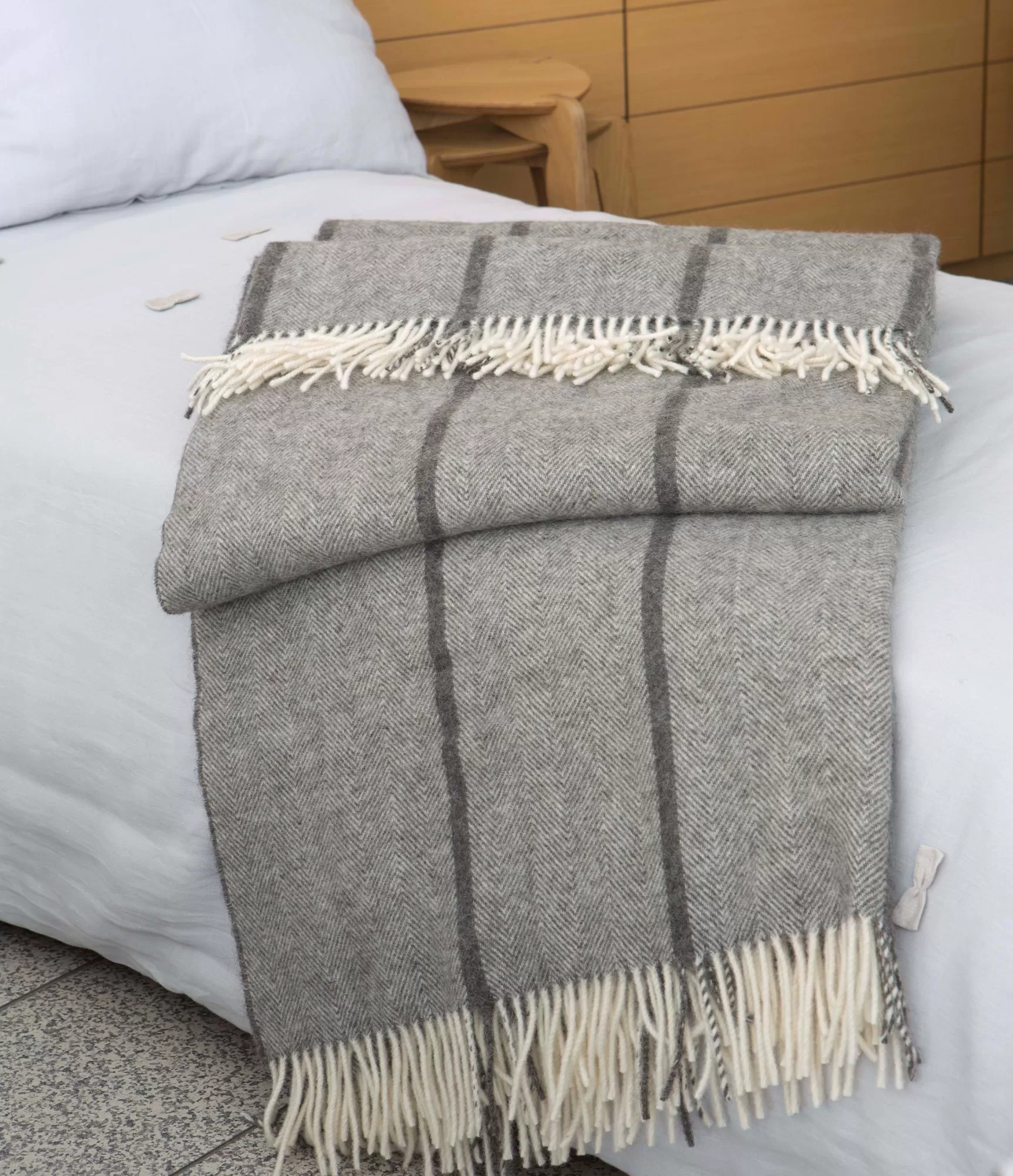 Šis lielais vilnas pleds uzreiz izceļas ar klasisku, bet vienmēr aktuālu eglītes rakstu, kas smalki atkārtojas visā audumā un piešķir tam vizuālu dziļumu un struktūru. Eglītes motīvs interjerā tiek augstu vērtēts savas elegances un mierīgās estētikas dēļ – tas rada kārtības, līdzsvara un siltuma sajūtu. Dabīgās baltās un tumši pelēkās krāsas salikums izskatās solīdi, mūsdienīgi un viegli pielāgojas dažādiem stiliem – no minimālisma līdz mājīgam, klasiskam interjeram.