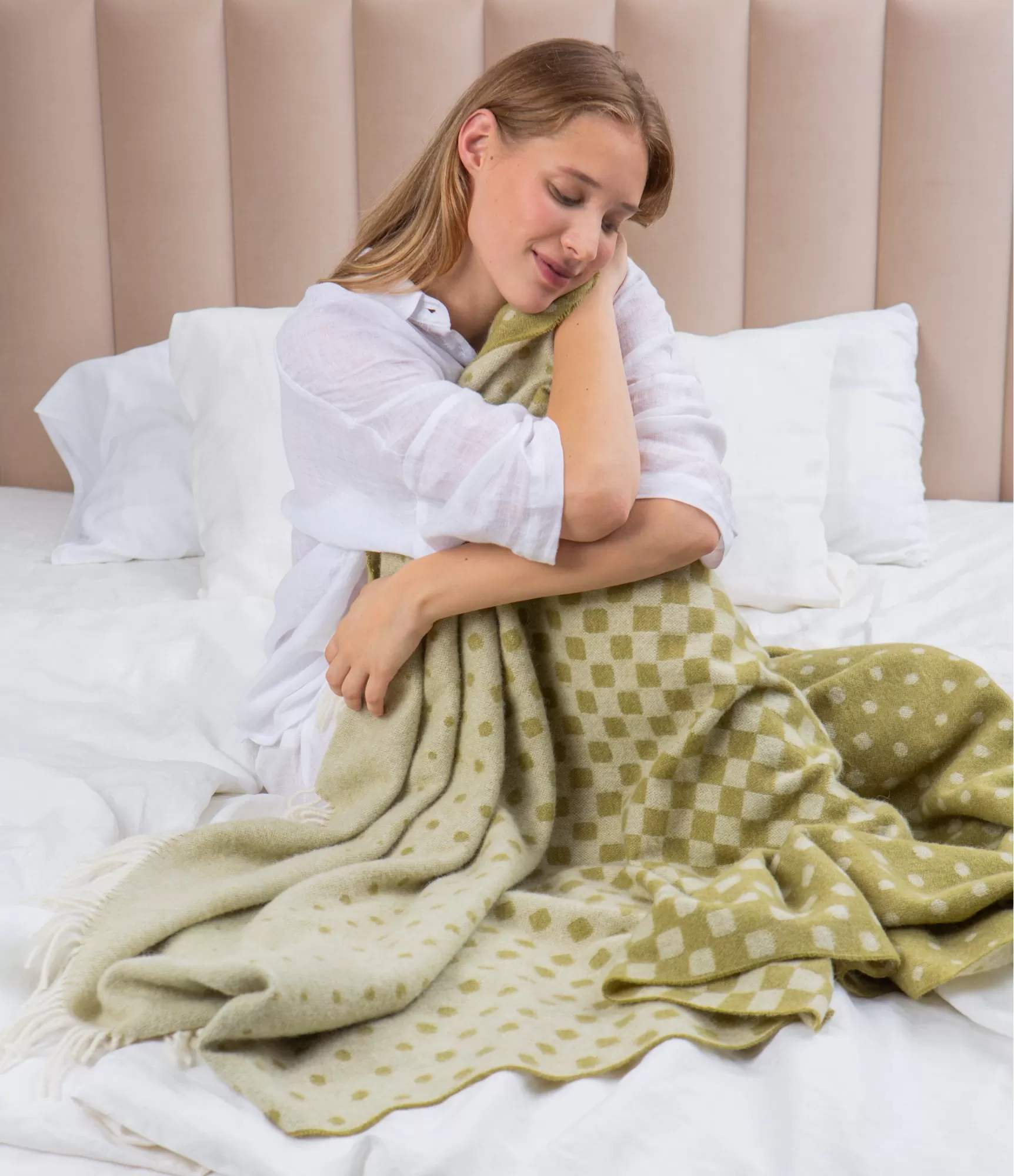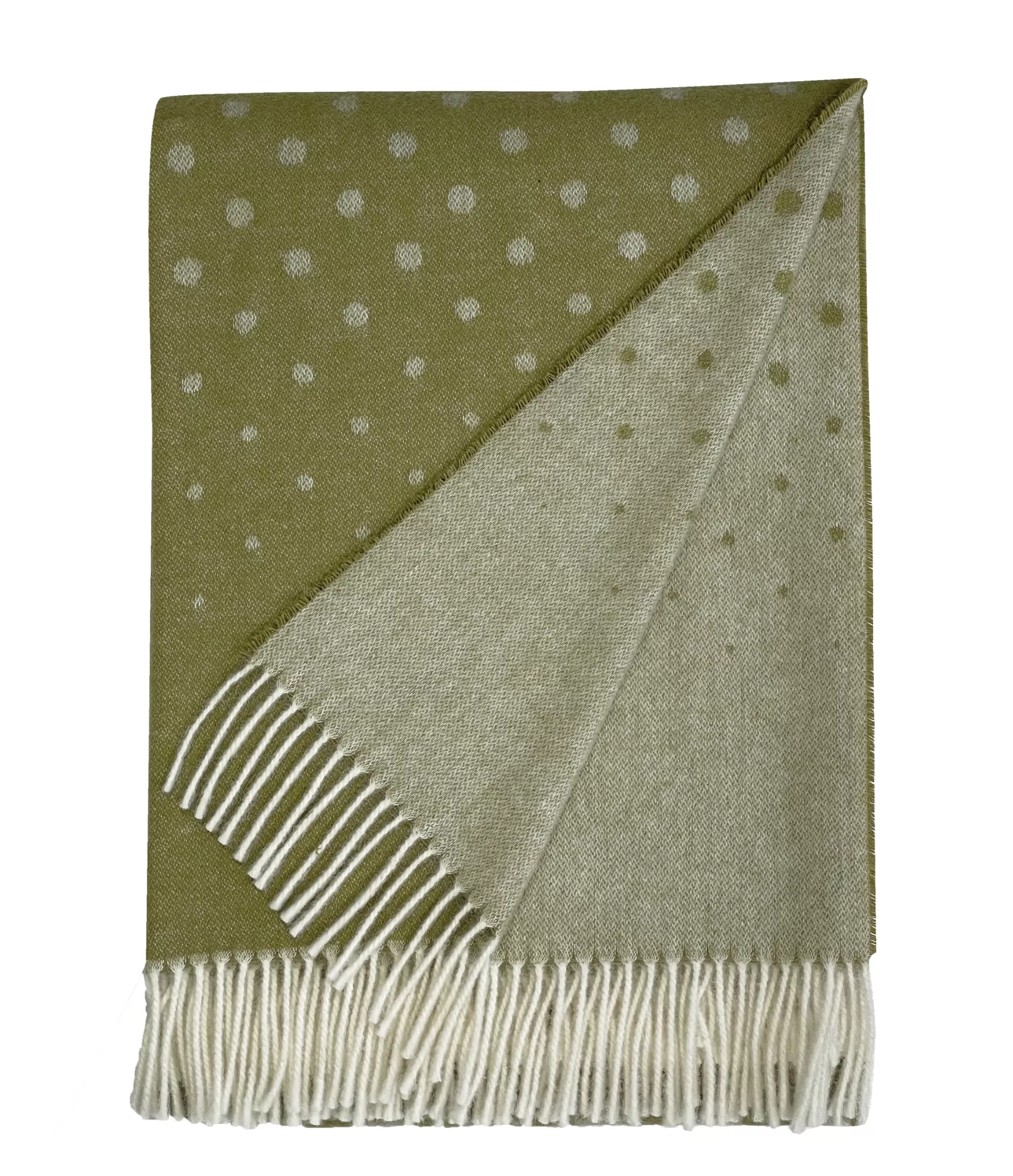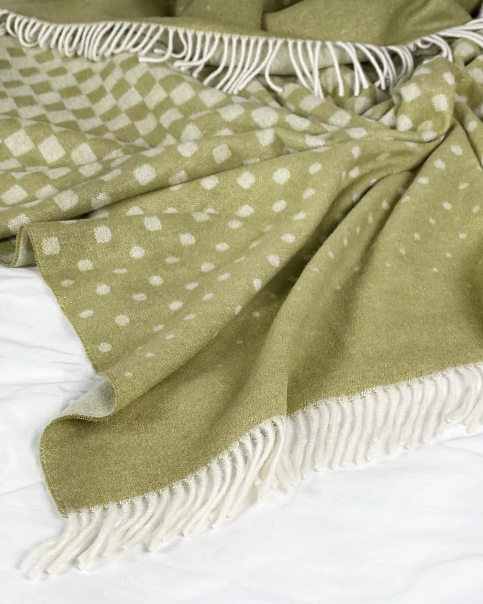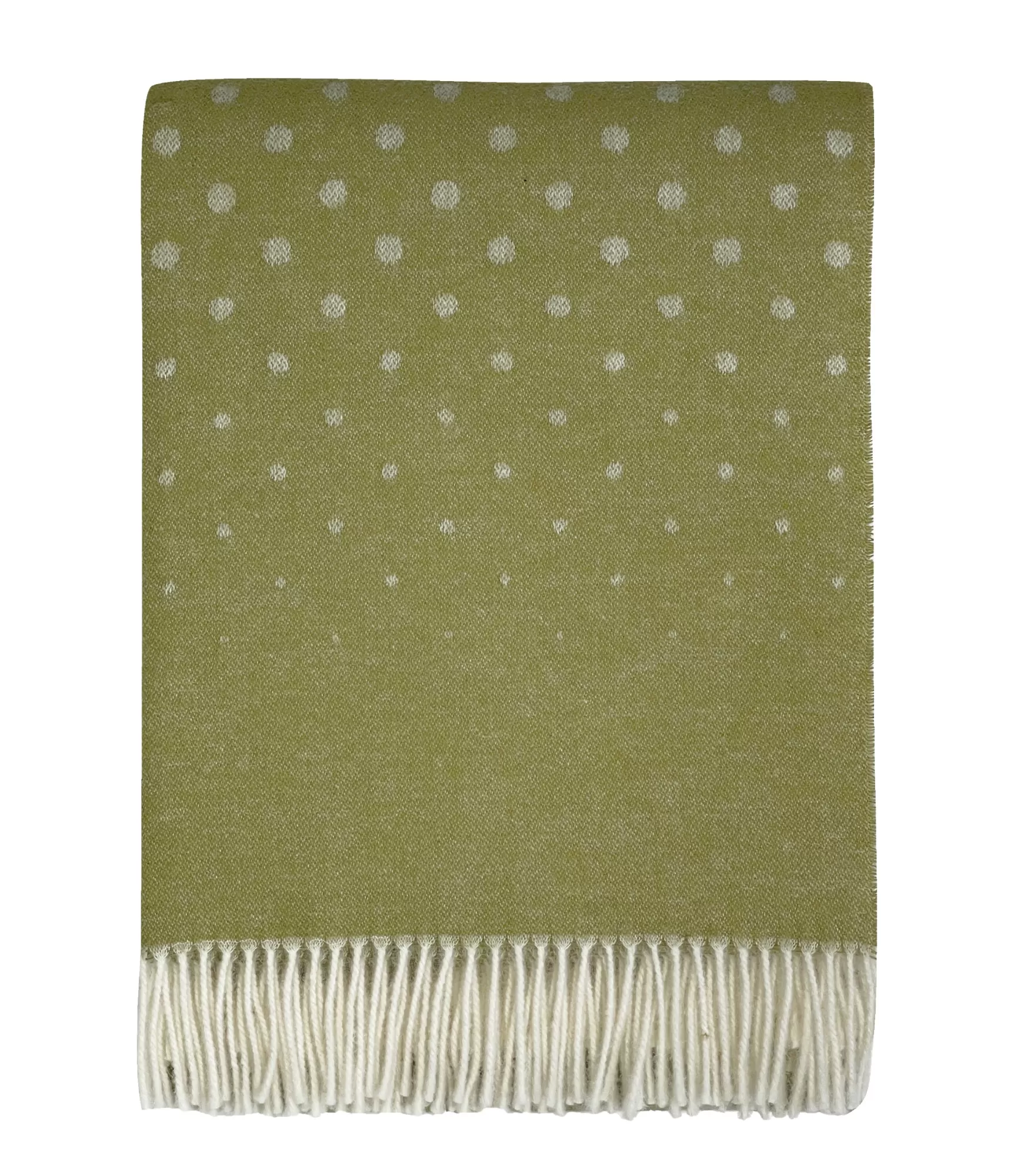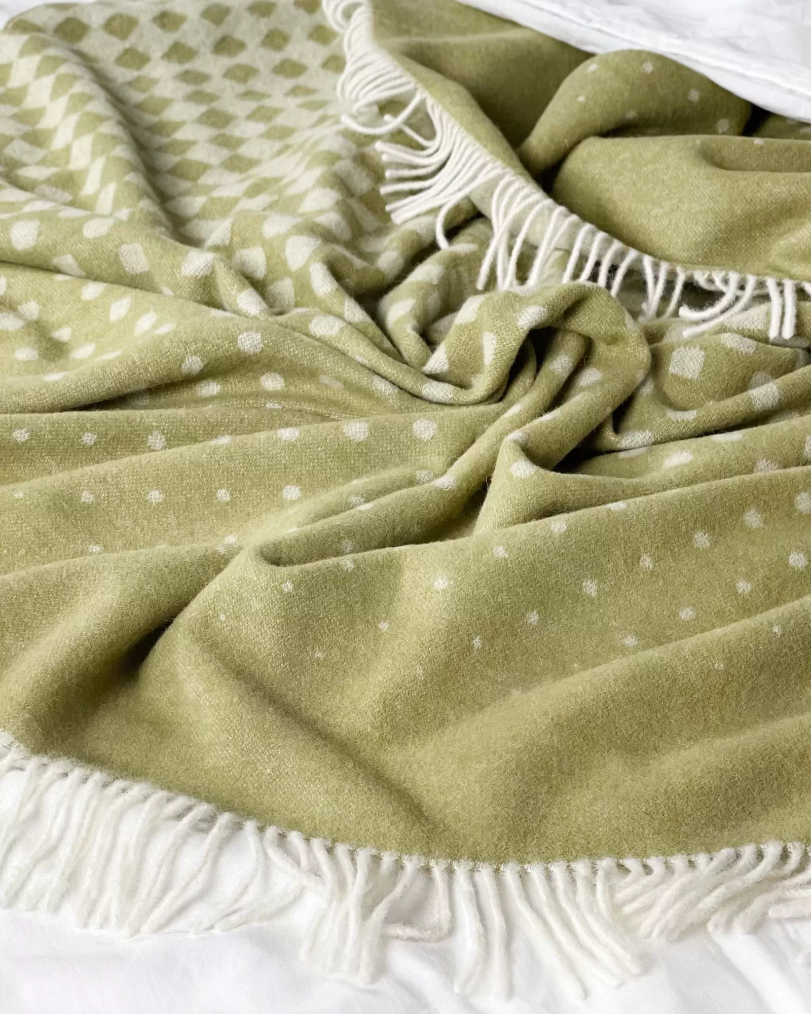 Alpaca 1077 izceļas ar maigu, dabīgu zaļganu toni ar baltiem punktiem. Raksts ir smalks – augšējā daļā punkti izvietoti retāk, zemāk tie kļūst blīvāki un pāriet sīkākā struktūrā. Šī pāreja piešķir pledam dzīvīgumu, vienlaikus saglabājot kārtīgu un estētisku izskatu. Gaišās, mīkstās bārkstis apakšā papildina kopējo viegluma iespaidu.