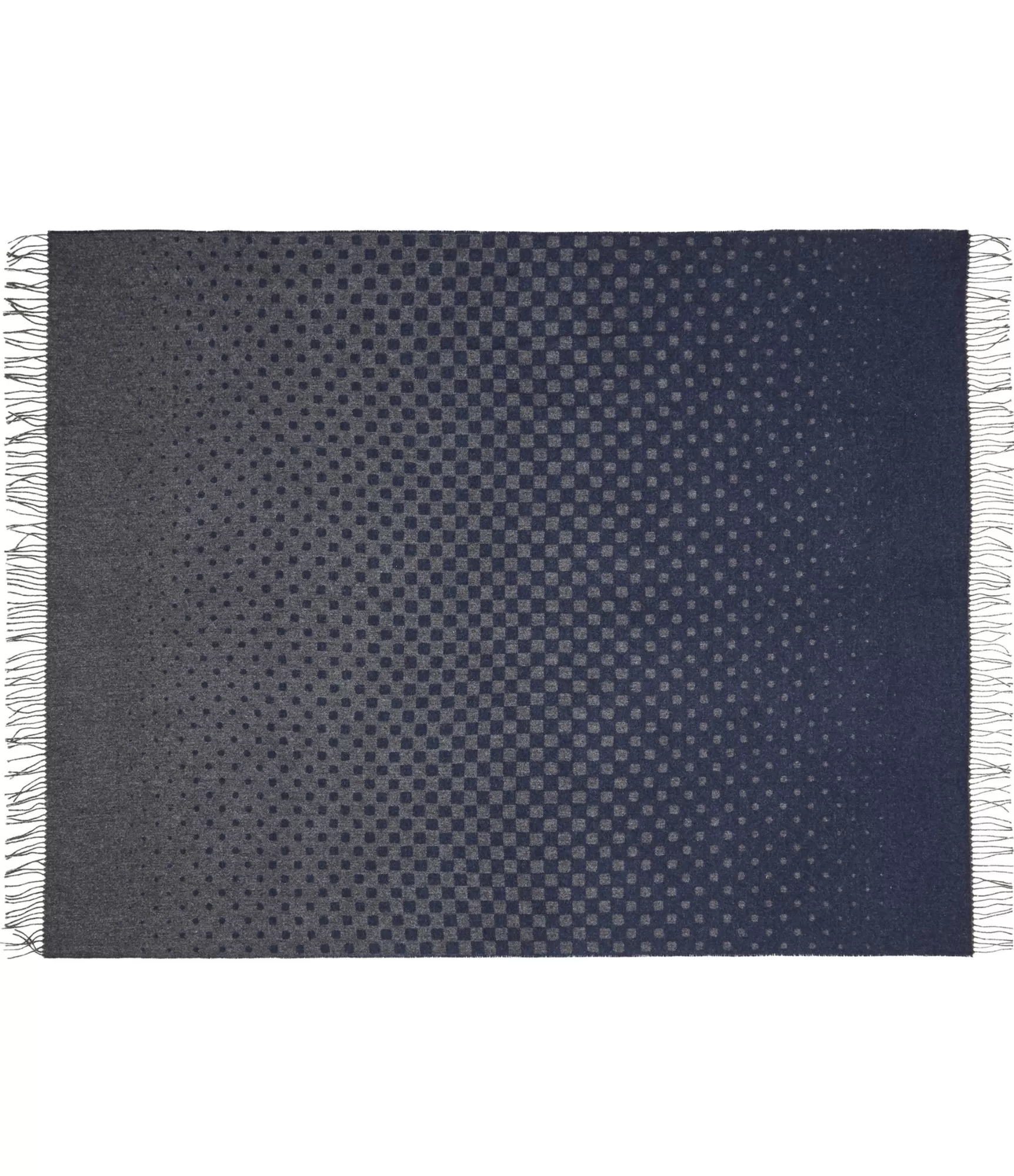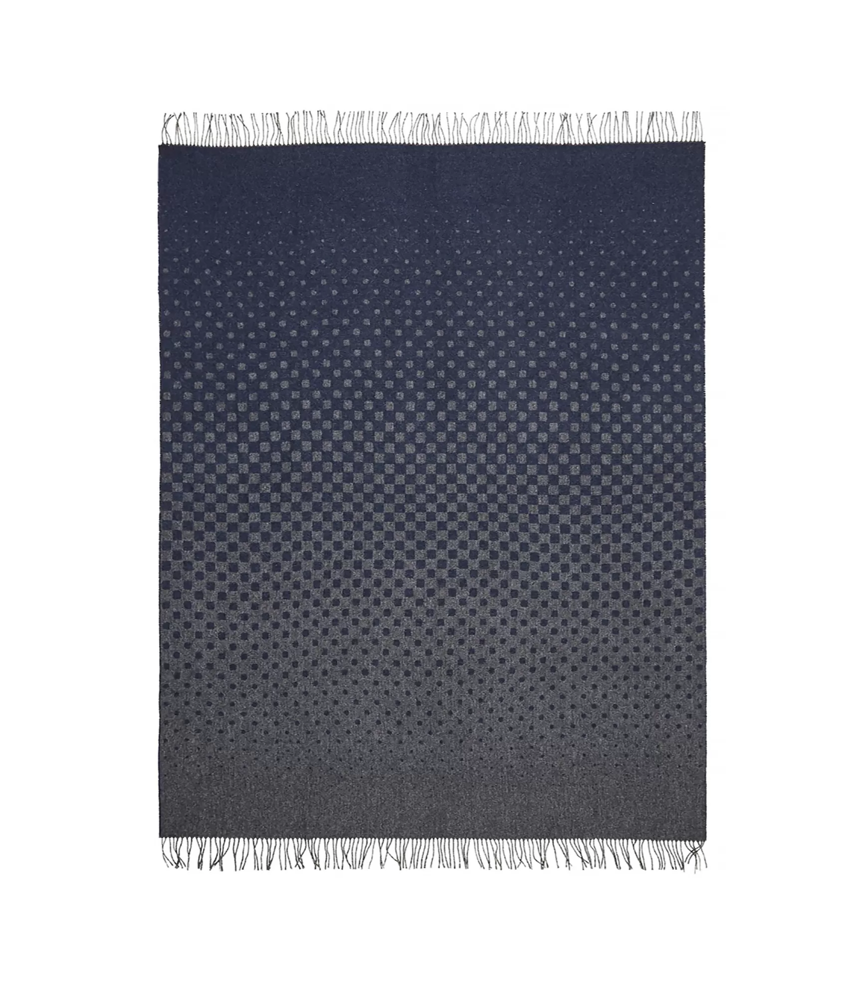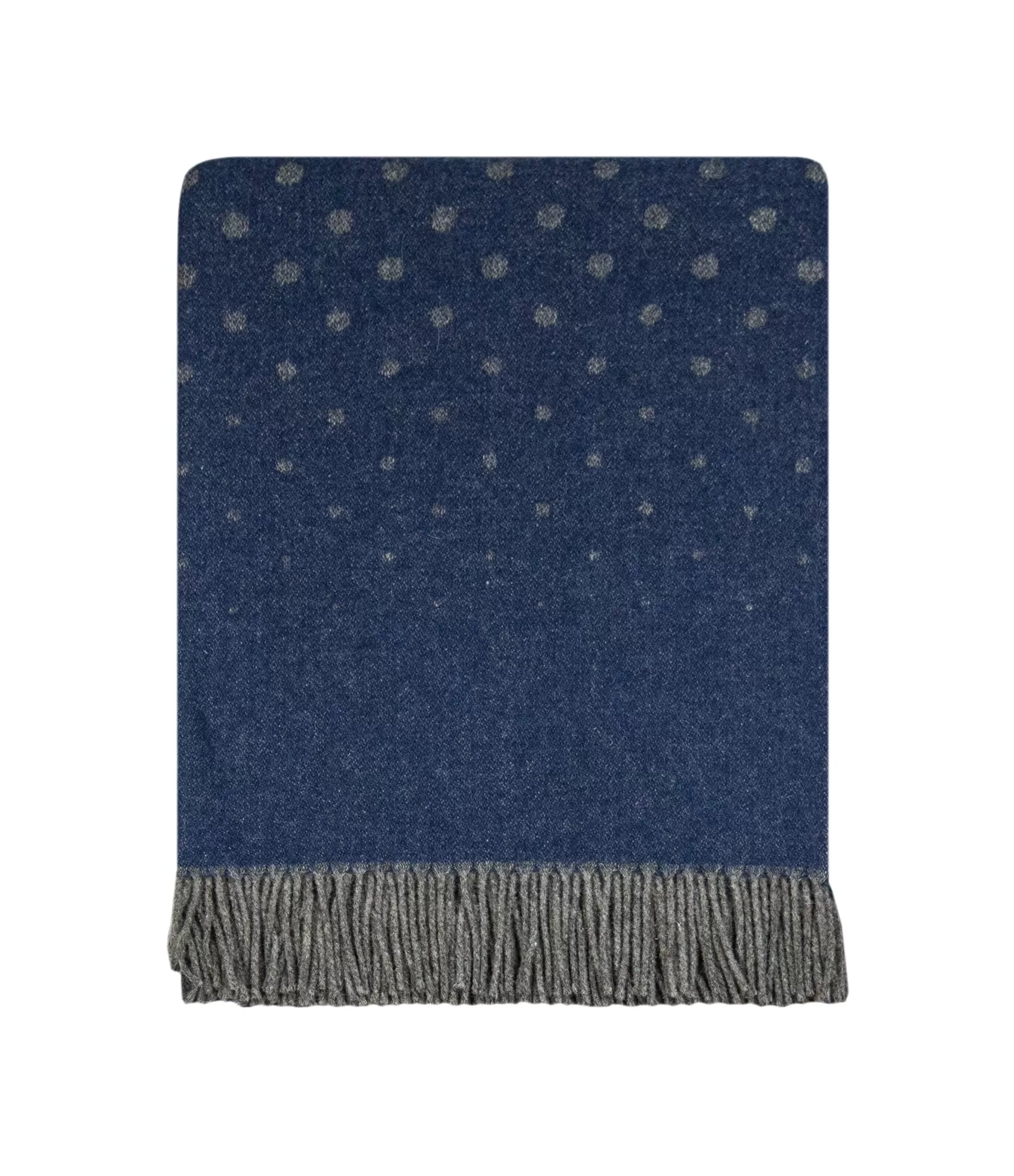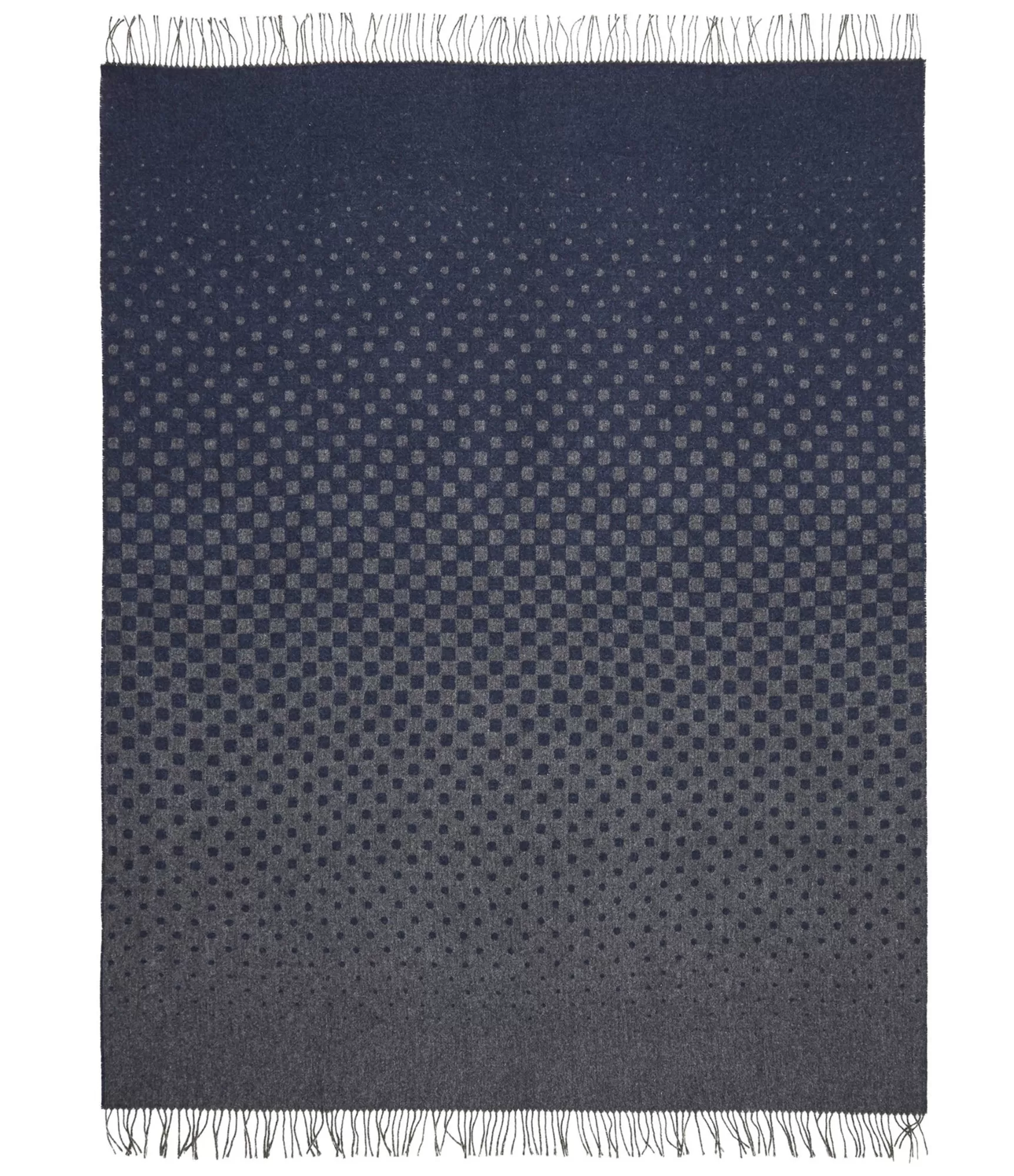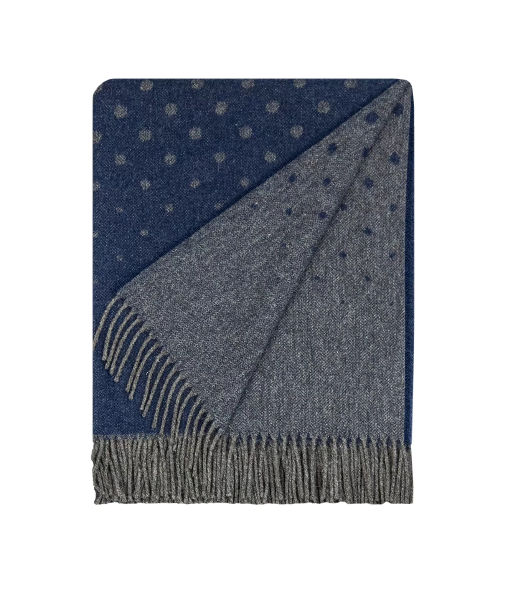 Šis pleds izceļas ar piesātinātu, dziļu tumši zilu krāsu, kas pāriet siltākos brūnganos toņos. Virsmā redzama smalka punktu un ģeometrisku motīvu pāreja rada interesantu vizuālo efektu – no attāluma tas izskatās mierīgs un vienots, bet tuvumā atklājas tekstūras spēle. Tā nav koša, bet raksturīga interjera detaļa, kas smalki papildina telpu.