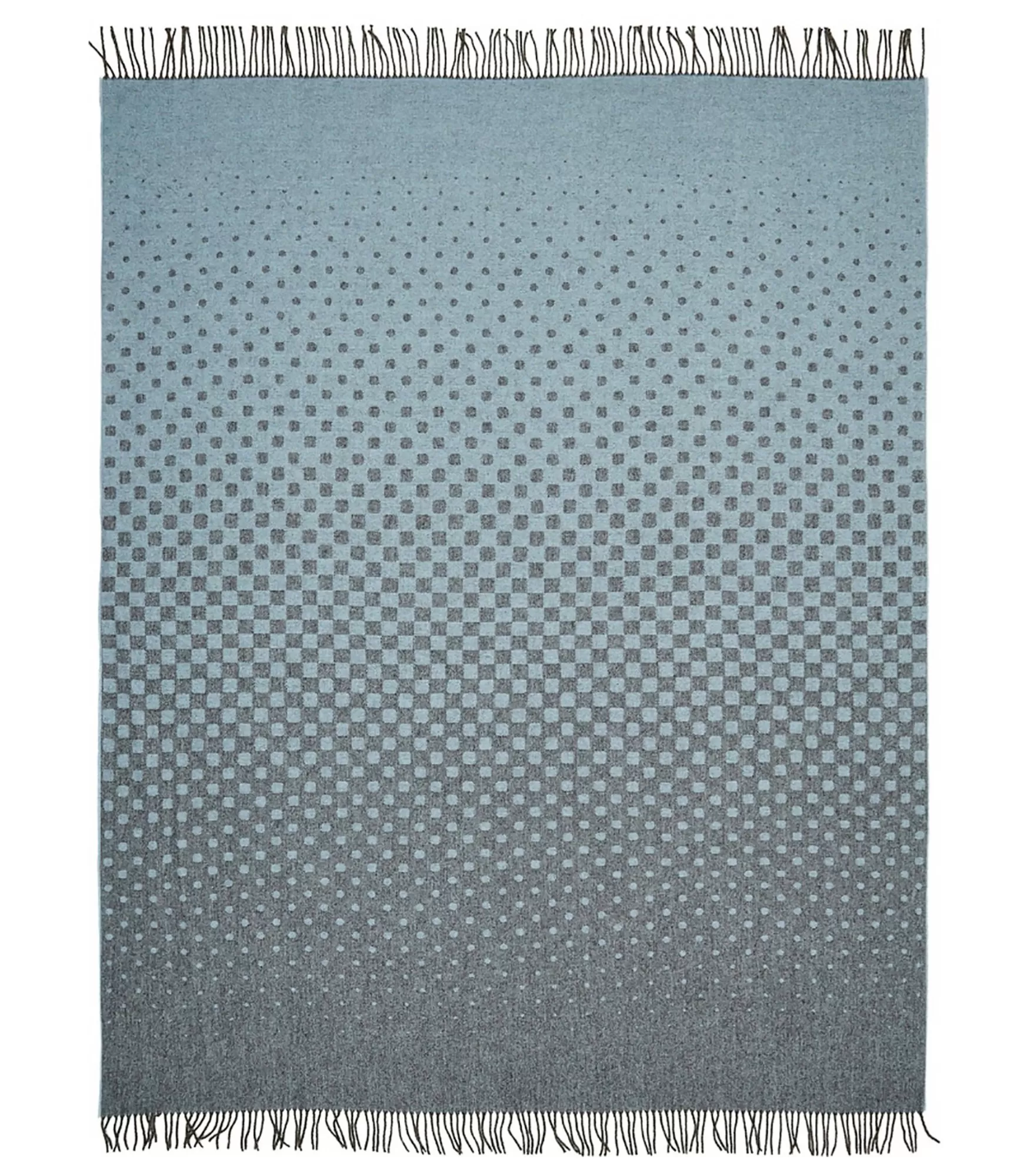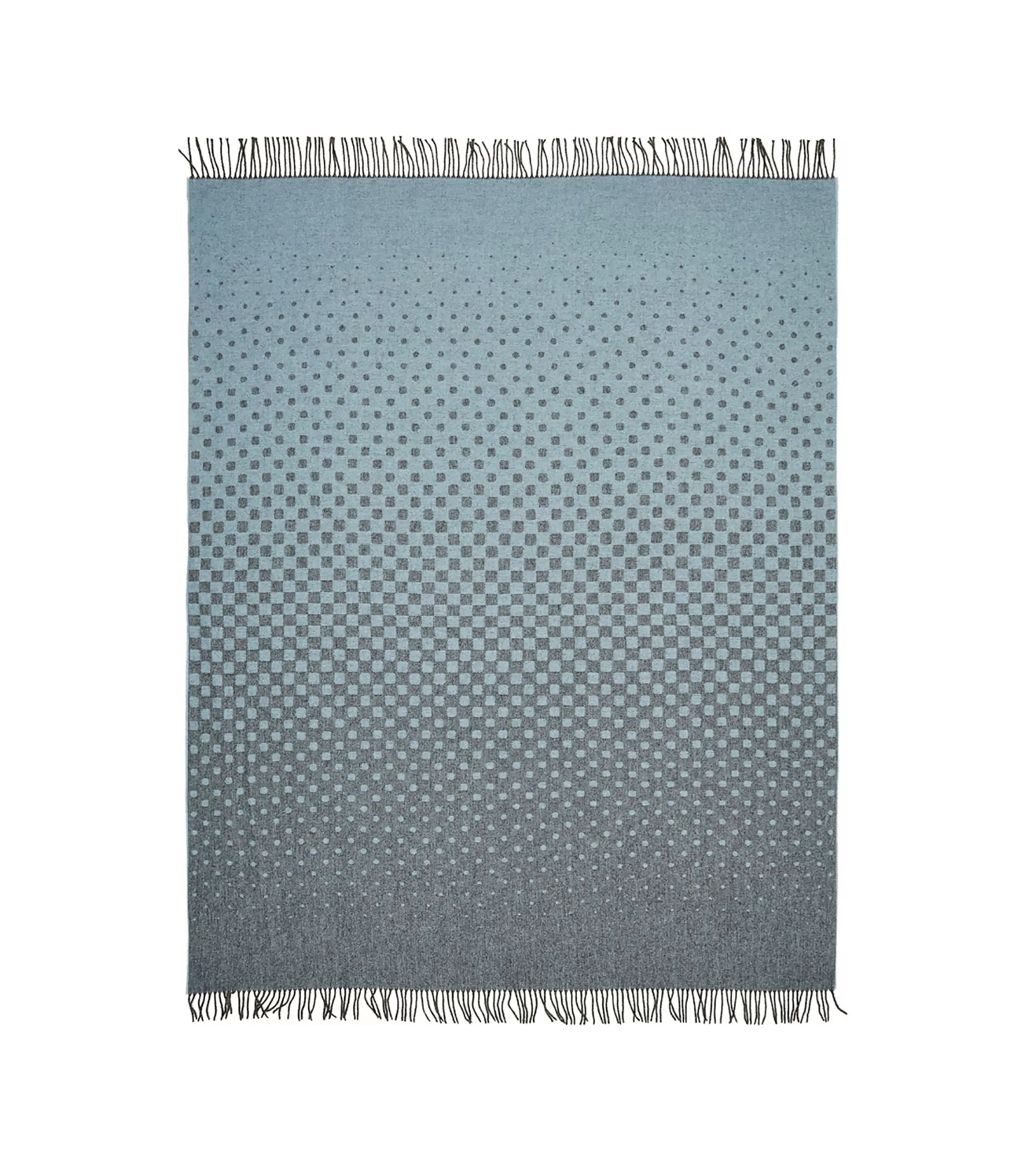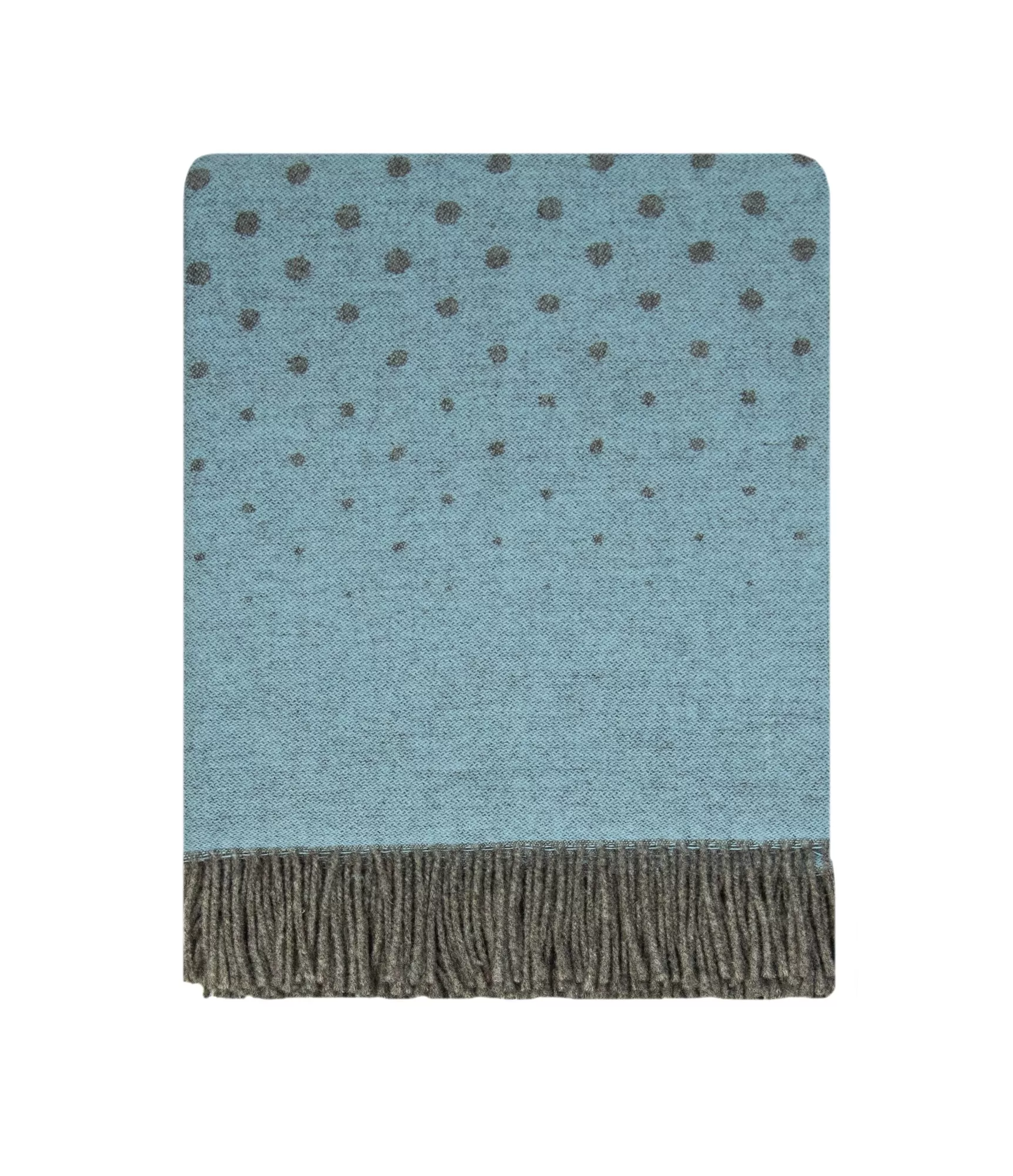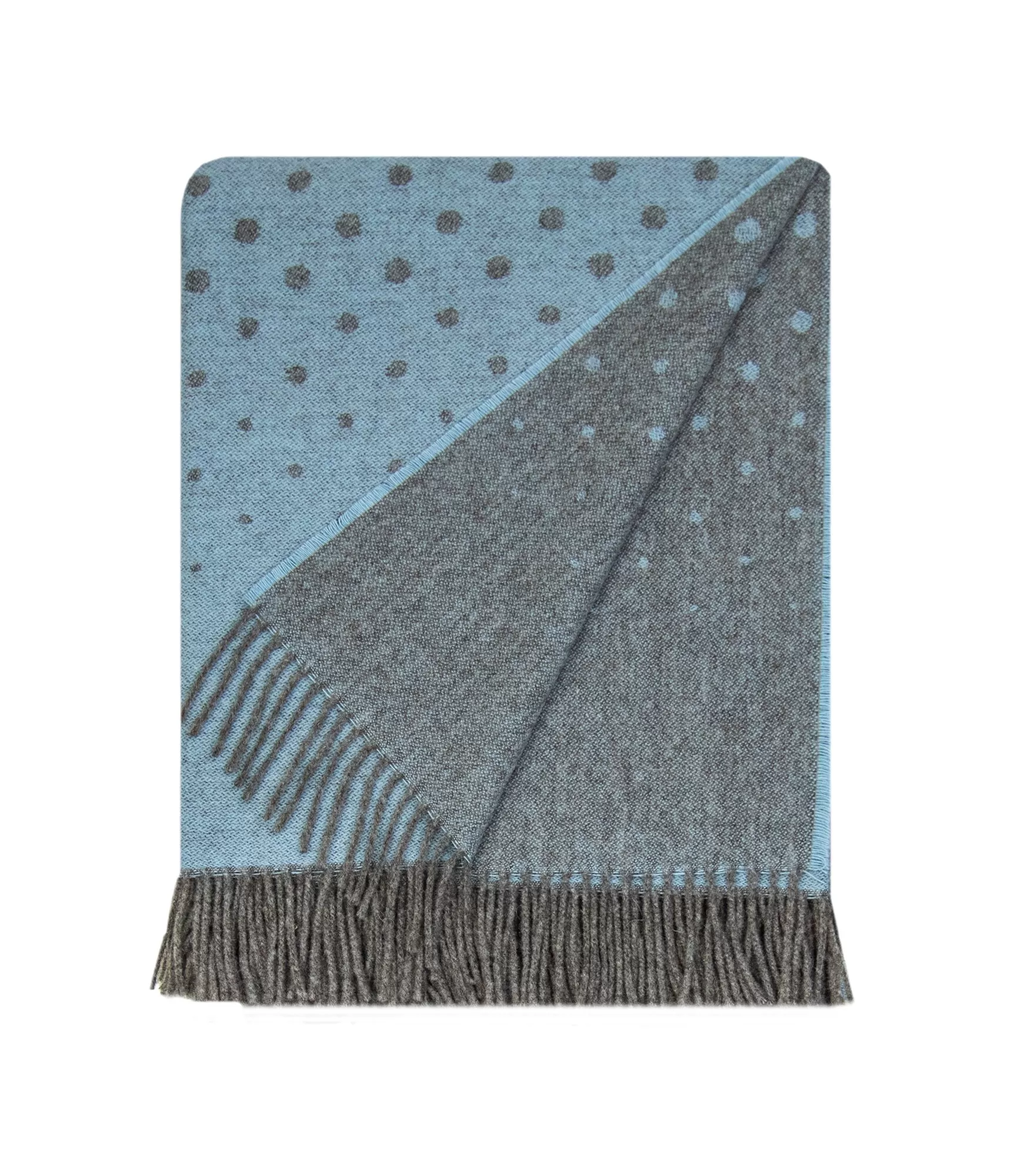 Alpaca Light Blue 1207 uzreiz piesaista uzmanību ar maigu, gaiši zilu krāsu, kas pāriet pelēkā tonī apakšējā daļā. Augšdaļā redzams smalks punktu raksts, kas zemāk kļūst blīvāks un pāriet ģeometriskā struktūrā. Šī pāreja piešķir pledam dzīvīgumu, vienlaikus saglabājot kārtīgu, modernu iespaidu.