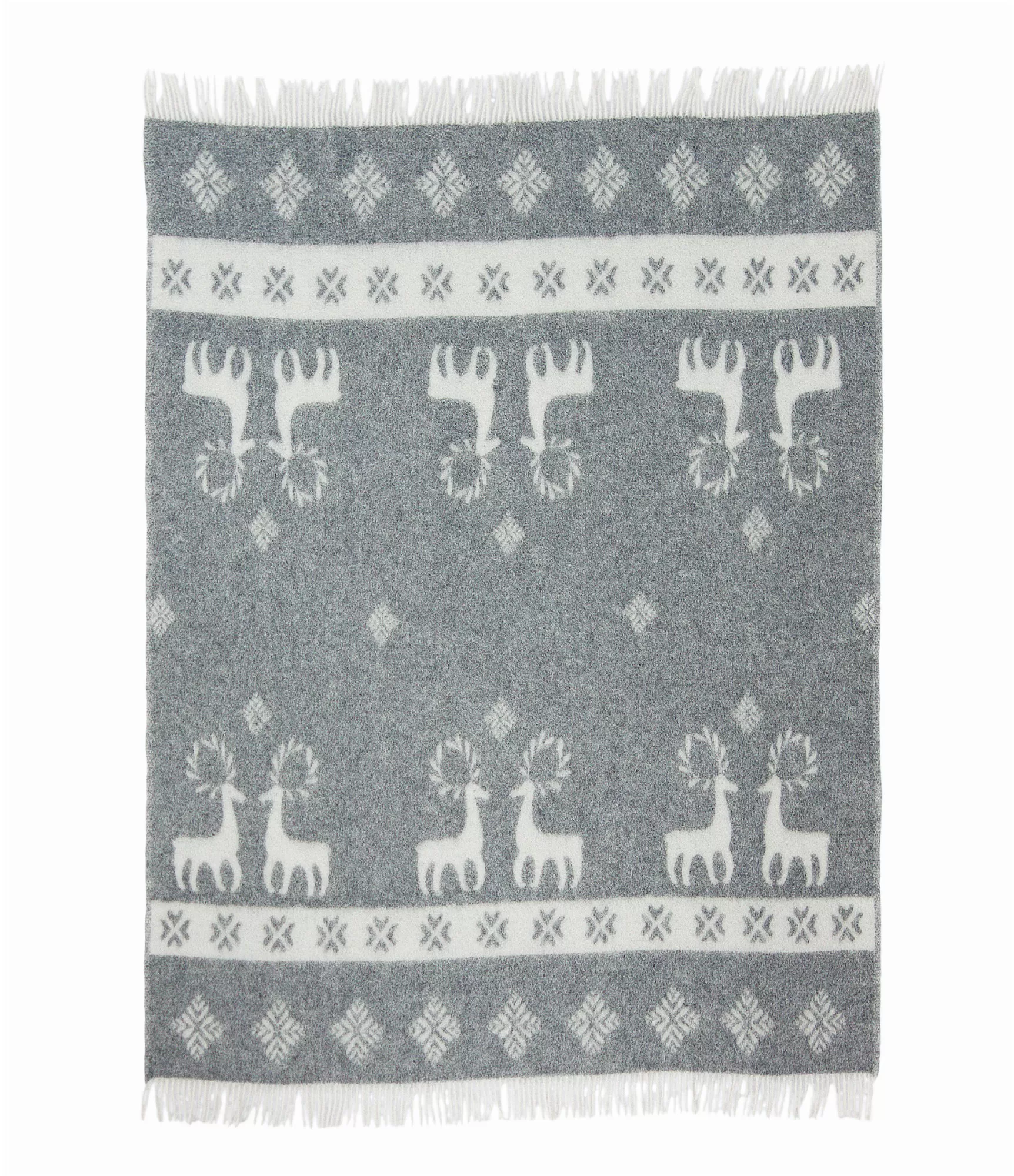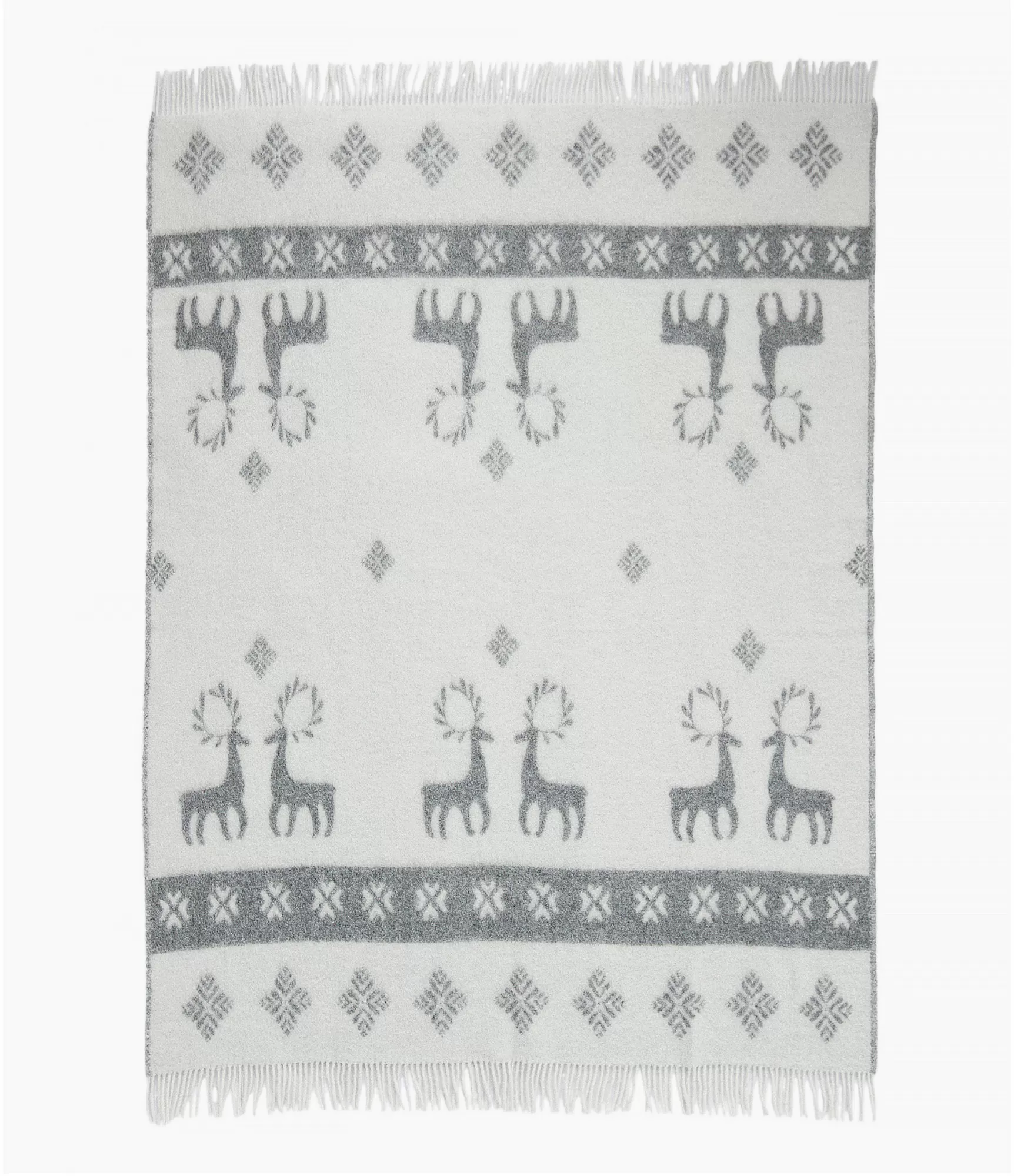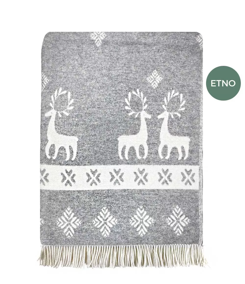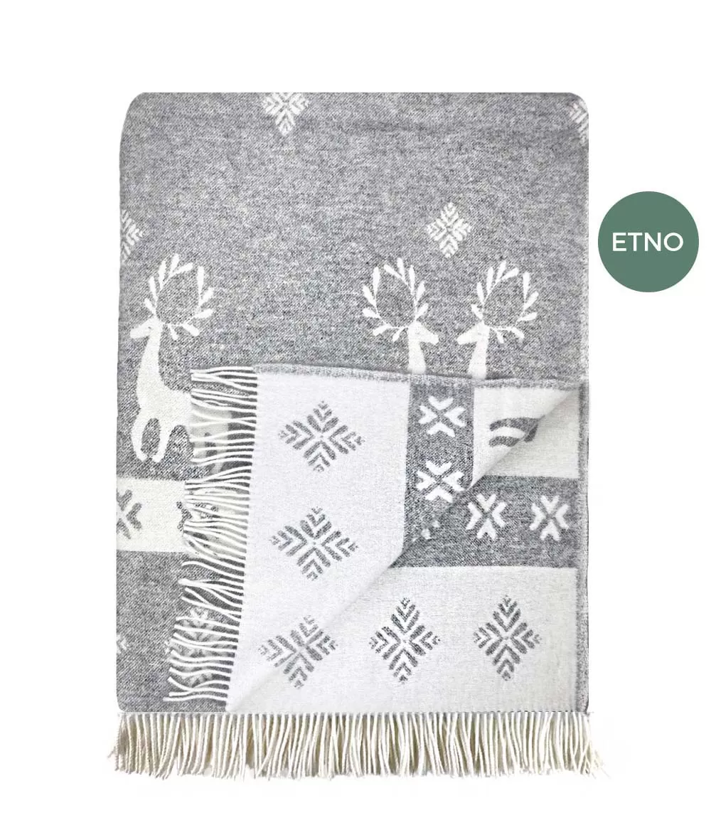 Šis žakarda pleds izceļas ar smalku estētiku, kurā apvienoti grafiski ornamenti un stilizēti briežu motīvi. Raksts ir kārtīgs un ritmisks, vienlaikus saglabājot vieglu pasakainuma noskaņu, kas nepārslogo interjeru. Pelēkās un baltās krāsas kontrasts piešķir pledam vizuālu tīrību, tāpēc tas viegli iederas gan modernā, gan klasiskā mājas interjerā. Abpusējais žakarda audums ļauj baudīt divas dažādas noskaņas – vienā pusē dominē gaišāks fons, otrā tas dabiski mainās vietām, radot jaunu vizuālo efektu.