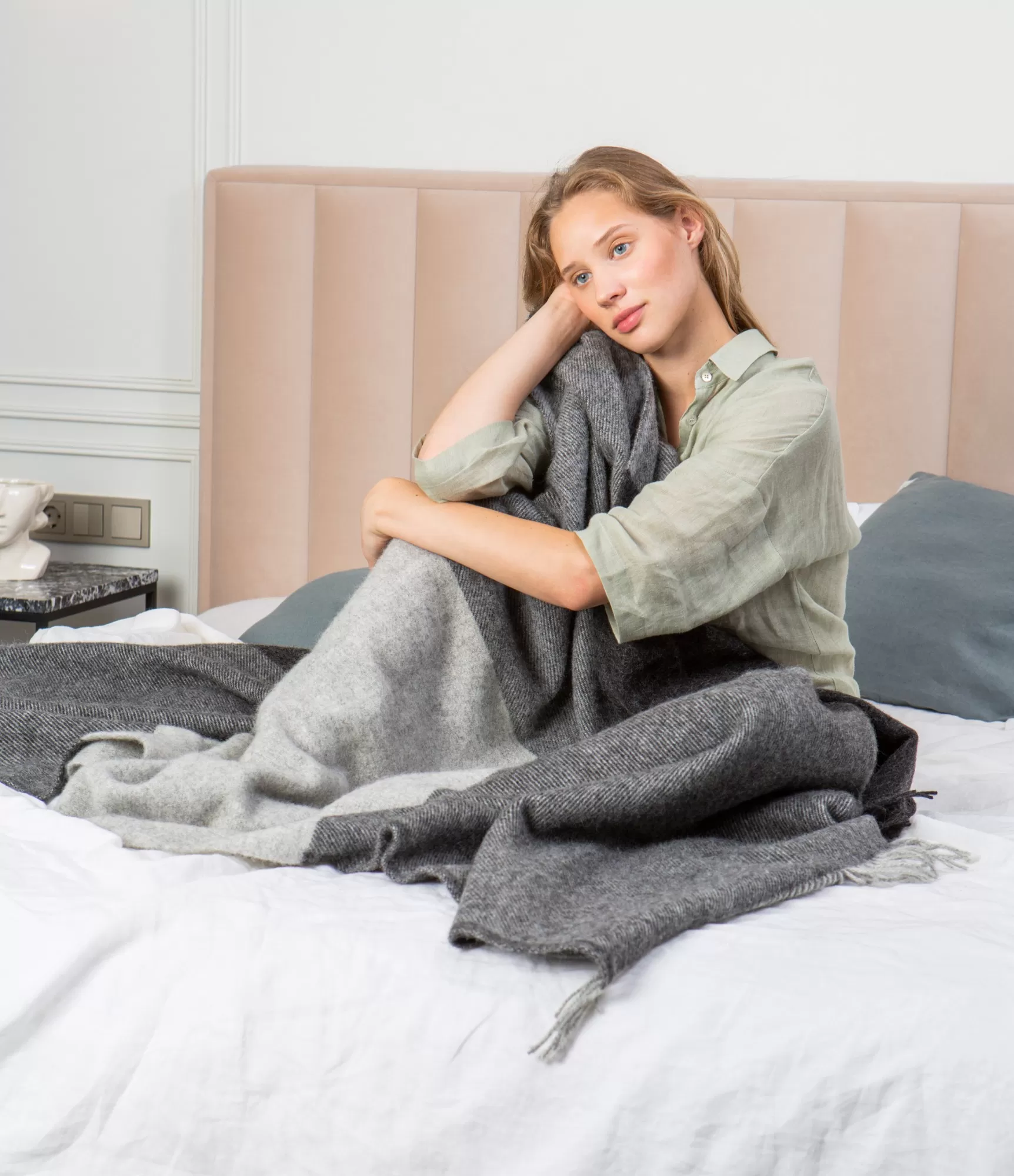 Pleds ir austs no 100 % Norvēģijas aitu vilnas, tādēļ tam piemīt dabīga siltuma regulēšana. Ziemā tas patīkami silda, ļauj ieritināties un atslābināties pēc garas dienas, bet siltākā gadalaikā vilna saglabā “elpojošas” īpašības – ideāli piemērota vēsiem vasaras vakariem terasē vai dārzā, kad gribas mājīgumu bez lieka karstuma. Tā ir tekstilija, kas pielāgojas gadalaikam un dzīves ritmam.