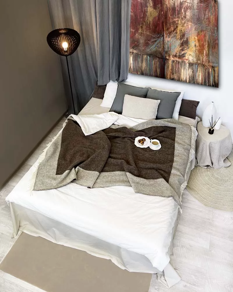 Pleda dizains skaidri atklājas gan salocītā veidā, gan brīvi pārklāts uz gultas vai dīvāna. Lielie krāsu bloki izskatās arhitektoniski – tie nevis virspusēji dekorē, bet strukturē telpu. Uz gultas šis pleds kļūst par dominējošu, bet ne agresīvu akcentu, kas apvieno tekstilu, mēbeles un sienu krāsas vienotā, harmoniskā kopainā. Tas lieliski sader ar linu, koku, akmeni, matētām virsmām un maigiem pelēkiem vai smilškrāsas toņiem.