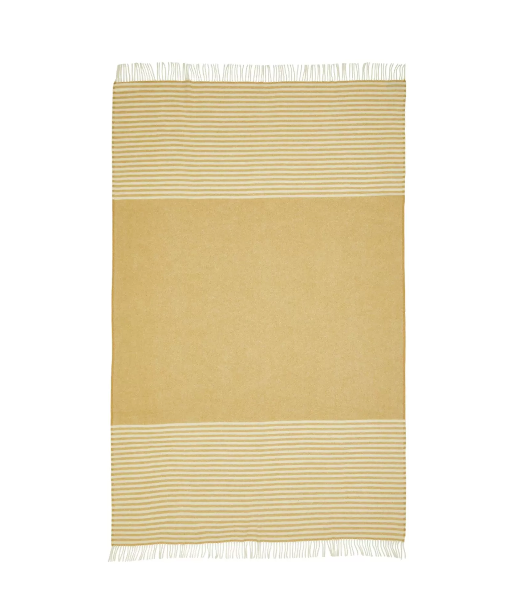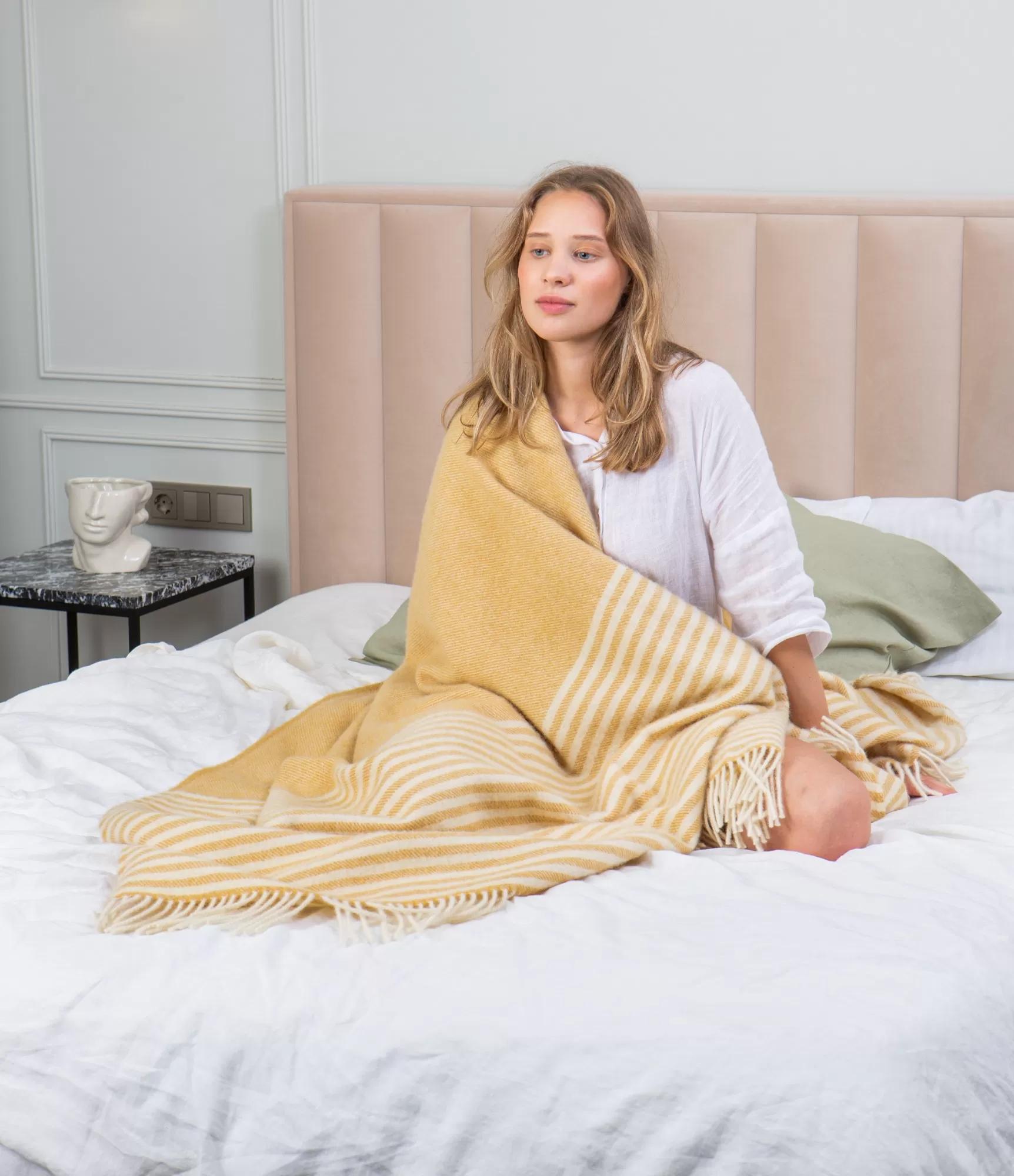 Scandimama Sunflower Yellow 0128 uzreiz piesaista uzmanību ar savu silto, saulaino dzelteno toni, kas interjerā ienes dzīvīgumu un gaismas sajūtu. Smalkās horizontālās svītras kombinācijā ar dabiski balto krāsu veido mūsdienīgu, sakārtotu dizainu, kas izskatās moderni, bet vienlaikus saglabā mājīgumu. Tas ir pleds, kas ne tikai papildina telpu, bet arī kļūst par skaidru stila akcentu.