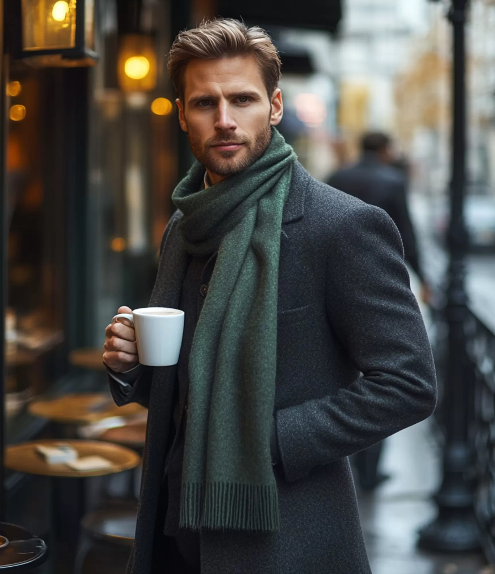 Tumši zaļā “Moss Green” krāsa ir viens no universālākajiem un stilīgākajiem risinājumiem vīriešu garderobam. Tas ir tonis, kas izskatās nobriedis, moderns un dabiski iekļaujas gan pilsētas, gan klasiskos tērpu salikumos. Šis dziļi pieklusinātais zaļais tonis piešķir koptēlam solīdumu un vienlaikus — smalku izcilību, ko apkārtējie pamana uzreiz. Šalle lieliski sader ar tumšu mēteli, melnu jaku, eleganti izskatās ar pelēku džemperi, bet ar žaketi vai uzvalku kļūst par atturīgi izteiksmīgu akcentu. Ikdienas kombinācijās ar džinsiem un neitrāliem džemperiem tā piešķir briedumu un kārtību — bez pārlieka spilgtuma, taču ar ļoti skaidru stila signālu.