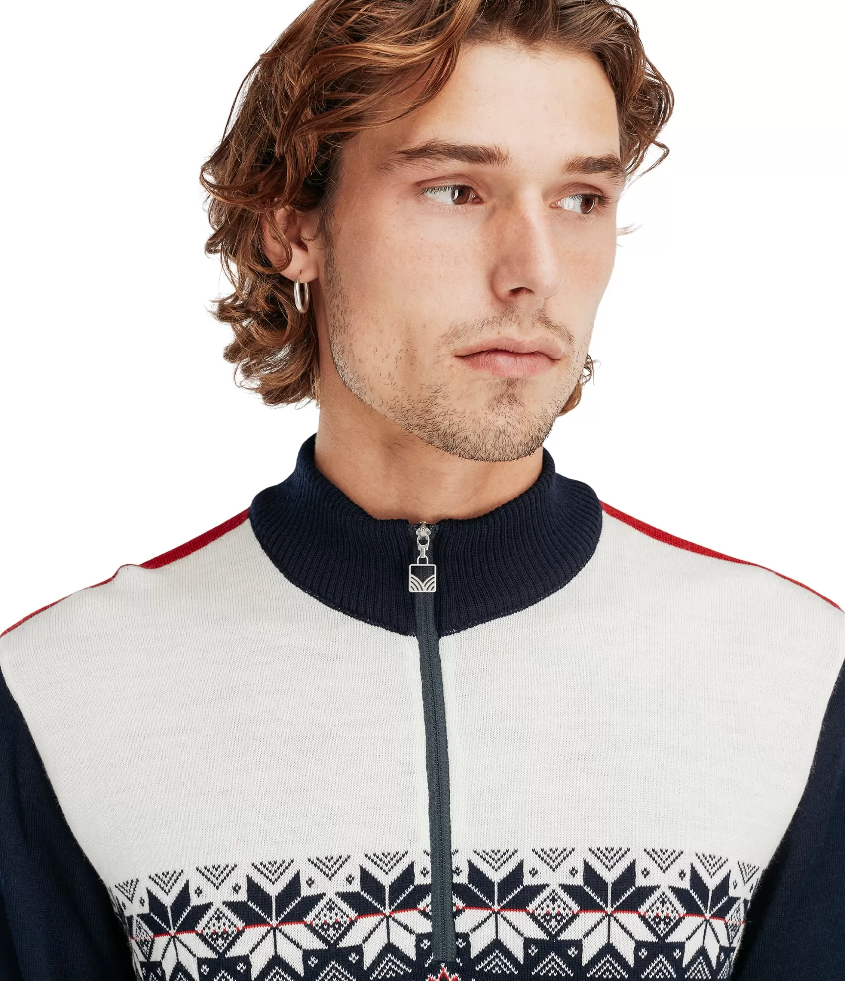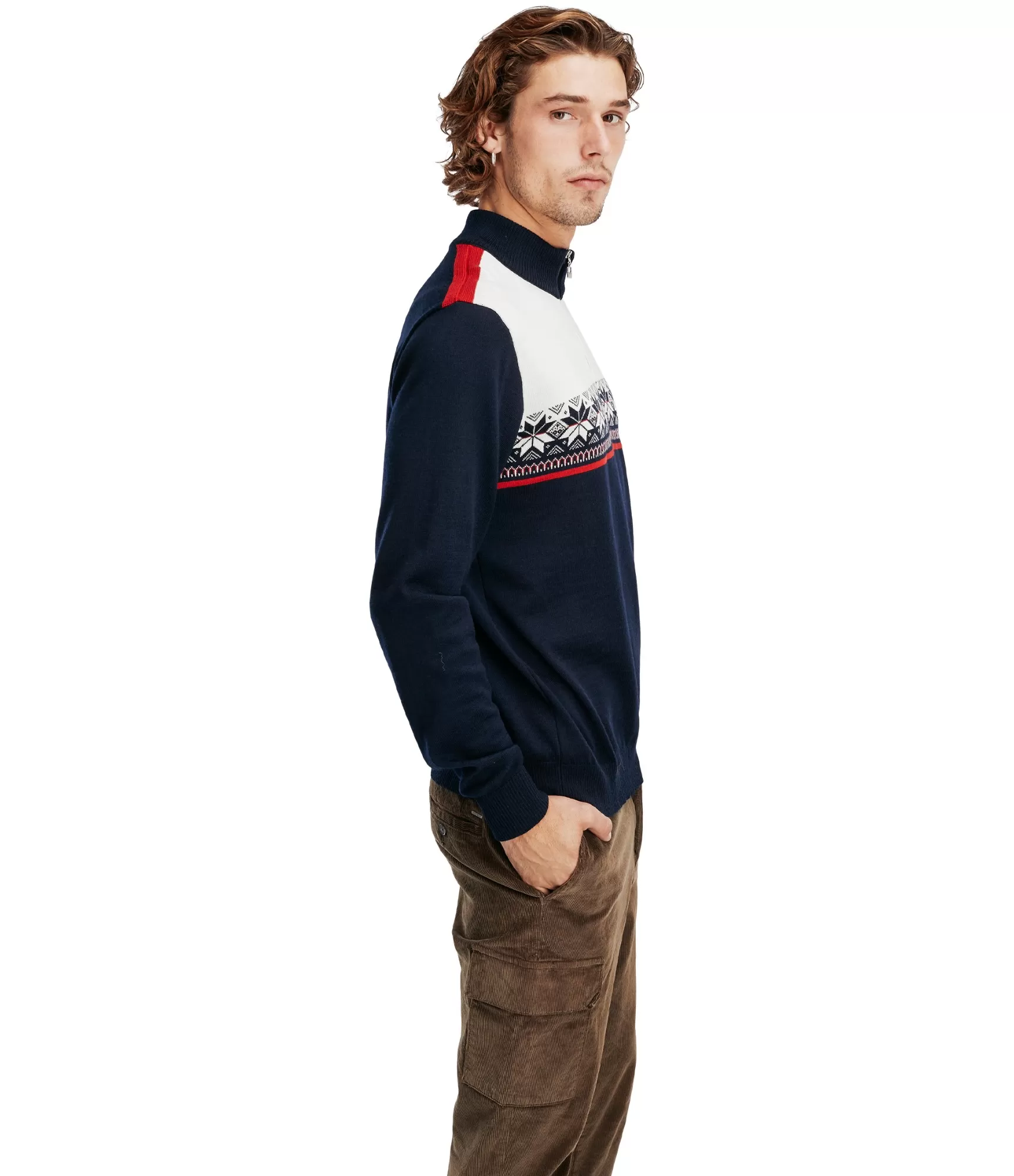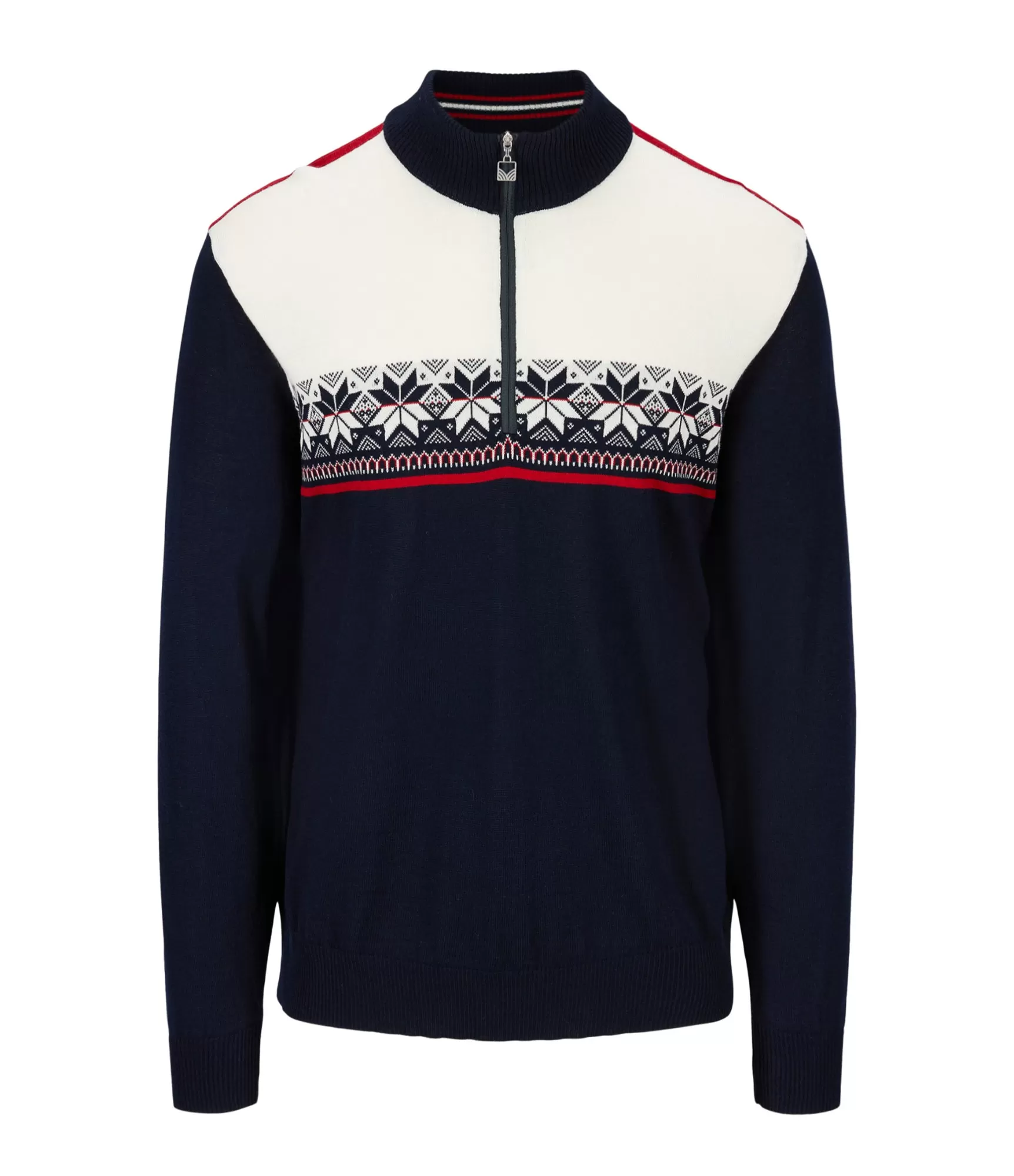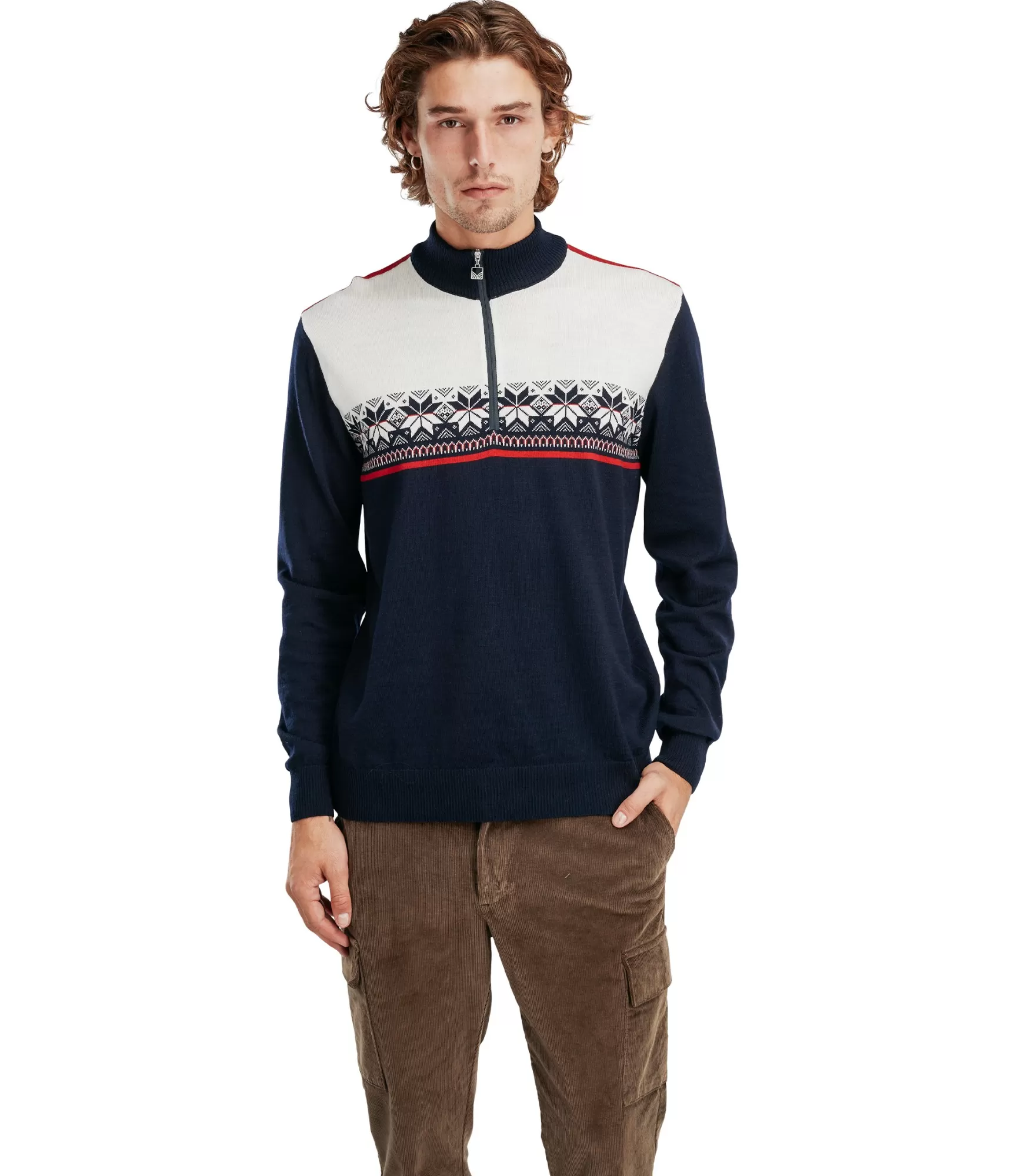 Tradicionālā norvēģu rakstība – ašpersiku ziedlapu roze – atgādina dziļas etniskas acis, bet džemperis paliek moderns, piemērots mūsdienu vīrietim. Daļēji augstā apkakle ar rāvējslēdzēju ļauj pielāgot siltumu pēc vajadzības, un mīkstā merino vilna nodrošina komfortu jebkuros apstākļos.