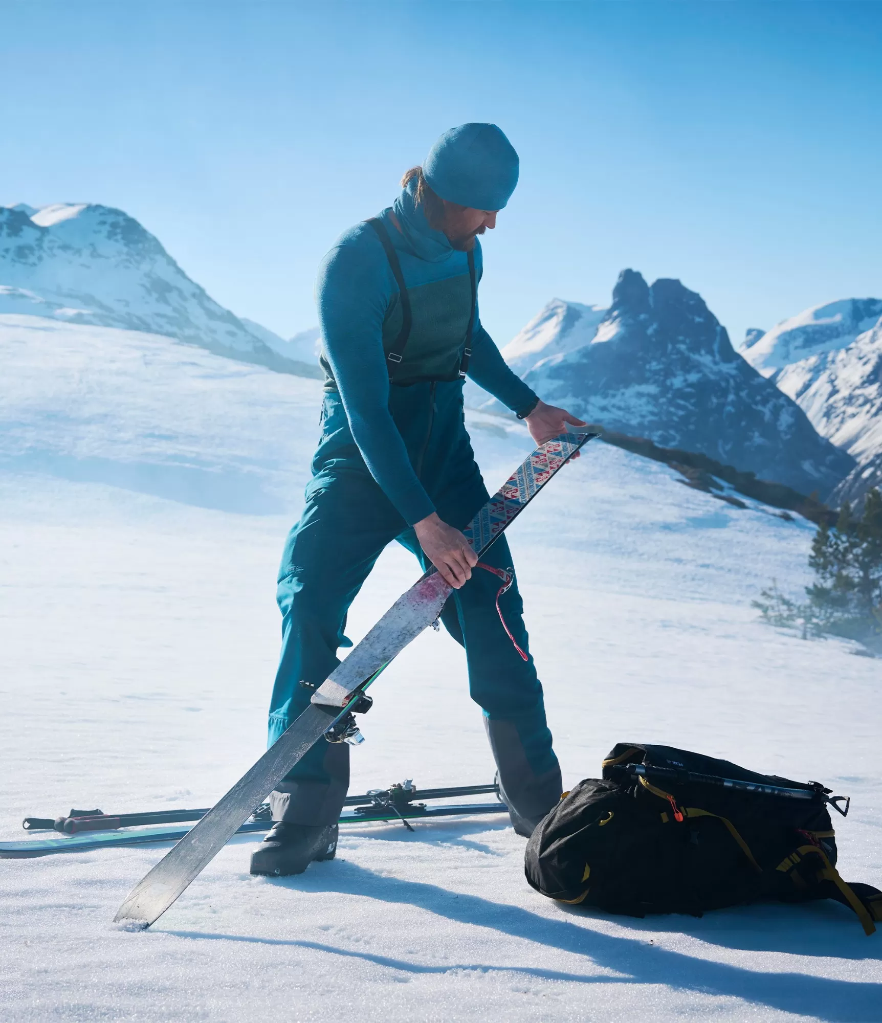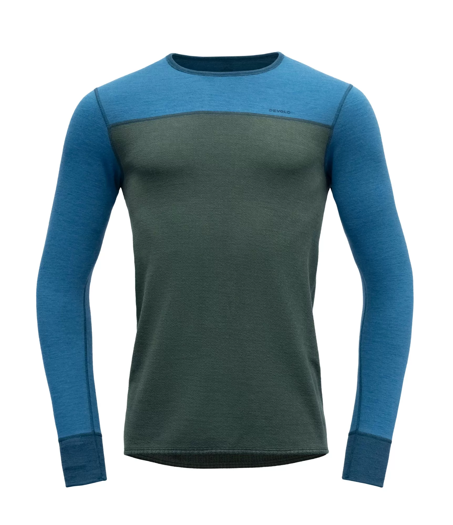 Fotoattēlā redzamais Devold Kvitegga Merino 230 termokrekls uzreiz piesaista uzmanību ar savu spilgto, kontrastējošo dizainu. Augšdaļa un piedurknes ir piesātināti zilā krāsā, bet jostasvieta ir dziļi meža zaļā krāsā. Šī Woods/Blue krāsu kombinācija ne tikai piešķir modernu sportisku izskatu, bet arī labi sader ar dažādu apģērbu brīvā dabā – sākot no tumšām slēpošanas biksēm līdz neitrālas krāsas jakām. Krekla siluets ir pieguļošs, ar pagarinātu muguru, kas palīdz saglabāt siltumu aktīvas kustības laikā.