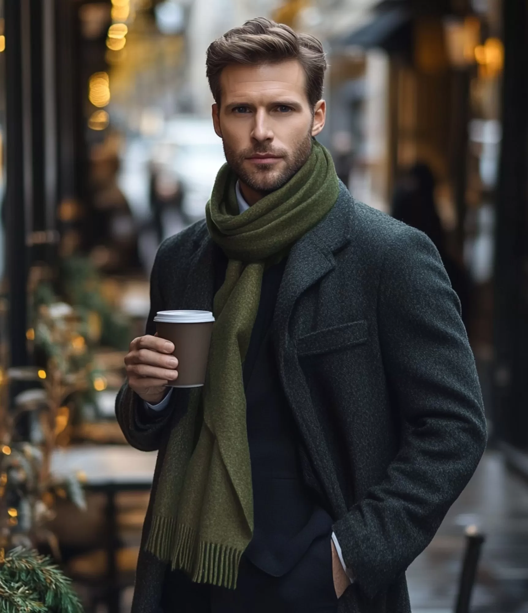 Zaļā „Seaweed Green“ krāsa ir viens no interesantākajiem un modernākajiem vīriešu garderobes toņiem. Tā nav koši zaļa – drīzāk dziļa, atturīga un izsmalcināta krāsa, kas atgādina dabisku, maigi pieskaņotu zemes paleti. Šī baby alpaca šalle ir radīta vīrietim, kurš novērtē stilu, bet izvēlas neitrālus, viegli kombinējamus toņus. „Seaweed Green“ piešķir tēlam raksturu un modernumu, vienlaikus saglabājot pietiekamu atturību, lai to varētu saskaņot ar melniem, grafīta, tumši ziliem, brūniem un bēšiem virsdrēbju toņiem.