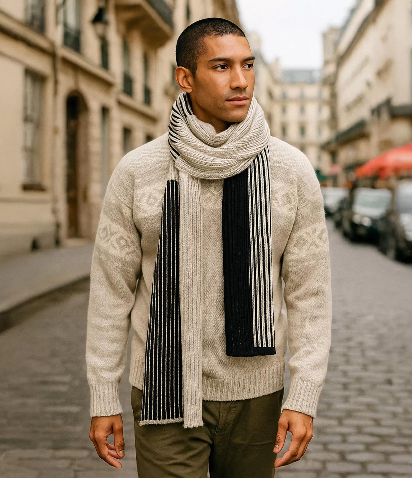 Mēs iesakām šo šalli valkāt gan ar klasisku mēteli, gan ar brīvāka stila apģērbu. Melni baltās svītras piešķirs stingrāku raksturu, bet maigais smilšu tonis papildinās siltumu un universalitāti. Tas ir aksesuārs, kas lieliski sader ar pilsētas stilu, bet ir pietiekami neitrāls, lai papildinātu arī formālāku tēlu.