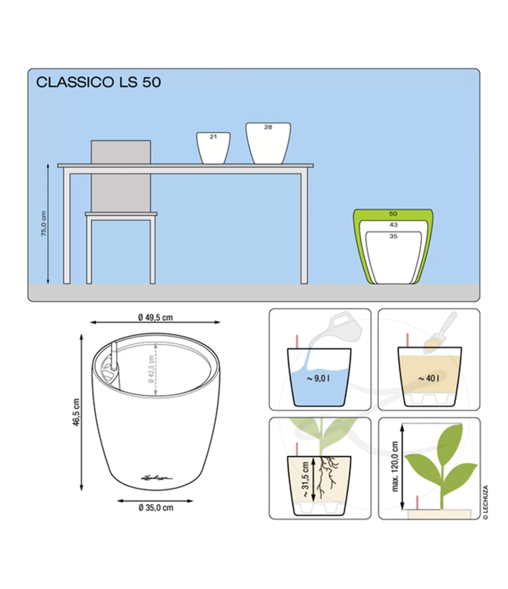 LECHUZA podu laistīšanas sistēma rūpējas par jūsu augiem jūsu vietā līdz pat 12 nedēļām. Nodrošina, lai augs optimālai augšanai saņemtu pareizo ūdens un mēslojuma daudzumu.