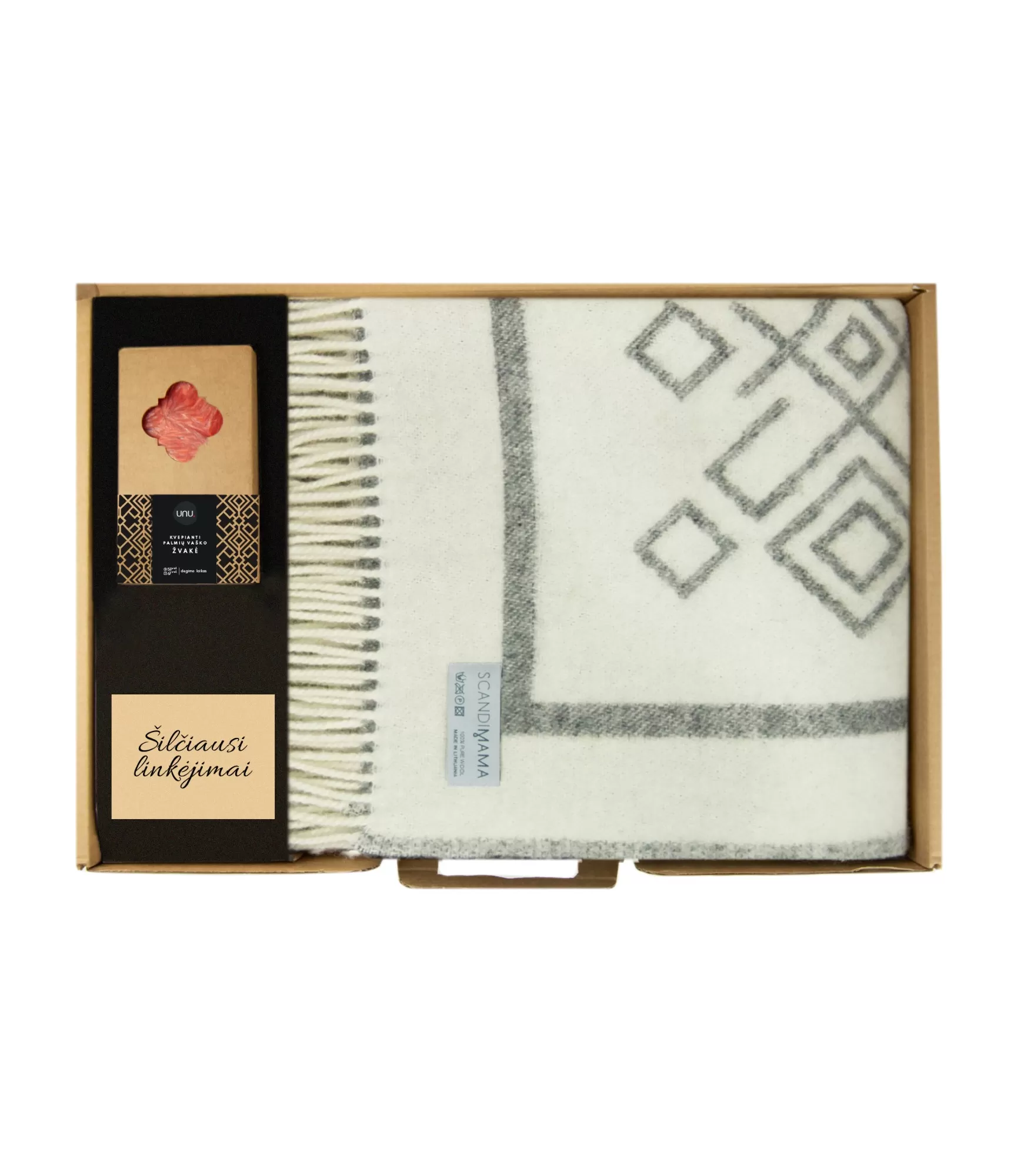 Vilnas pleda un smaržojošās sveces komplekts ir mājīga, silta un vienmēr noderīga dāvana, kas piešķir nozīmi dāvanai.